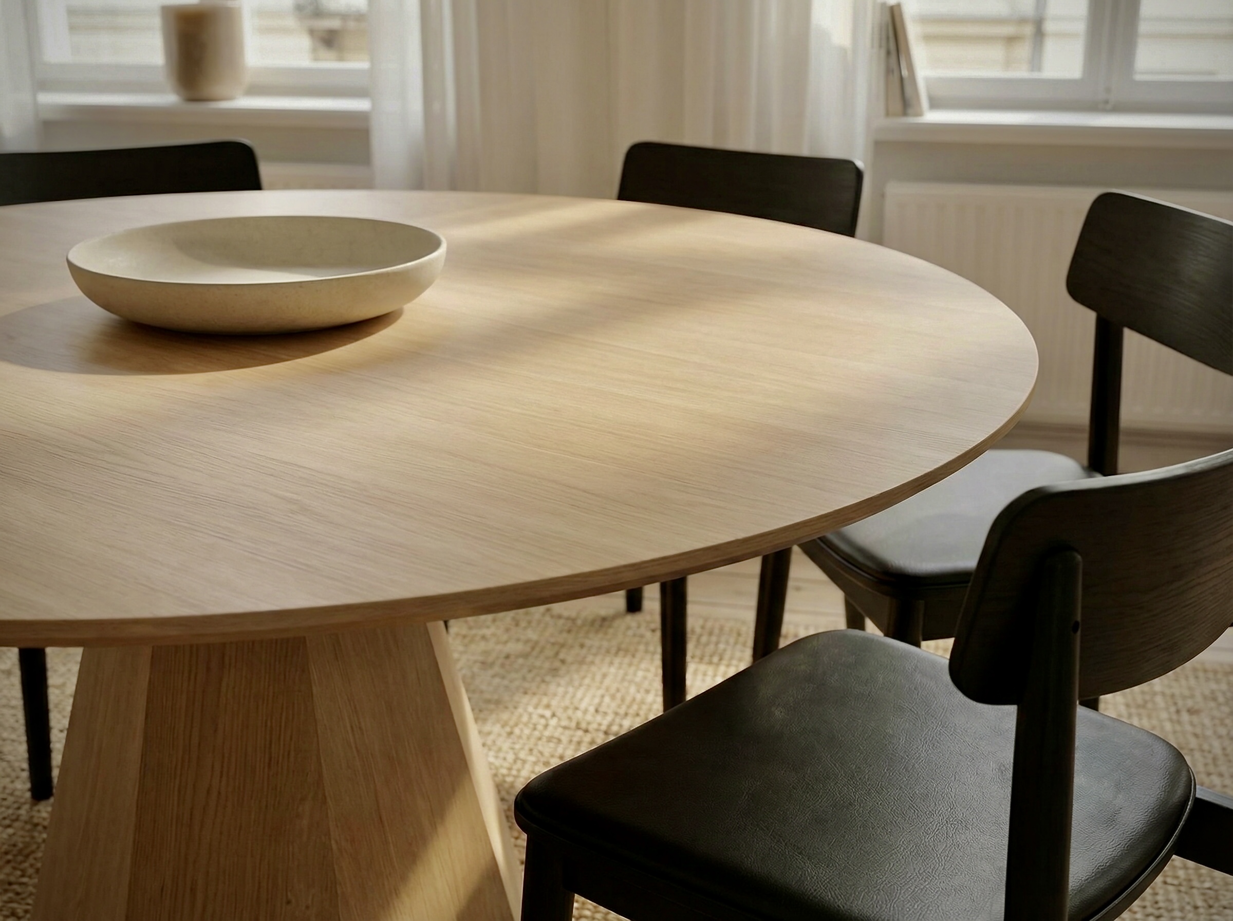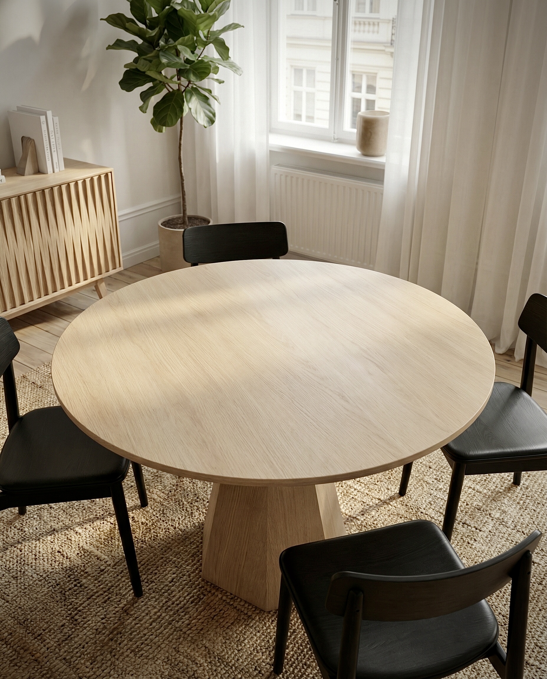 Jego kształt nawiązuje do delikatnej formy podgrzybka, co nadaje mu subtelności i oryginalności. Okrągły dębowy blat doskonale komponuje się z solidną nogą, która przybiera niezwykły kształt ostrosłupa o podstawie sześciokąta, stopniowo zwężając się ku górze. Ta unikalna konstrukcja nadaje lekkości i finezji, jednocześnie zapewniając stabilność.