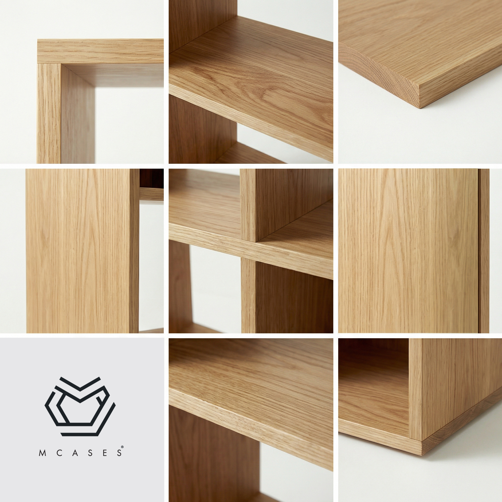 Konstrukcja regału wykonana jest z wysokiej jakości drewna, starannie wykończonego naturalnym fornirem dębowym. Całość zabezpieczona została twardym olejem, który podkreśla rysunek drewna, zapewnia trwałość oraz odporność na codzienne użytkowanie.