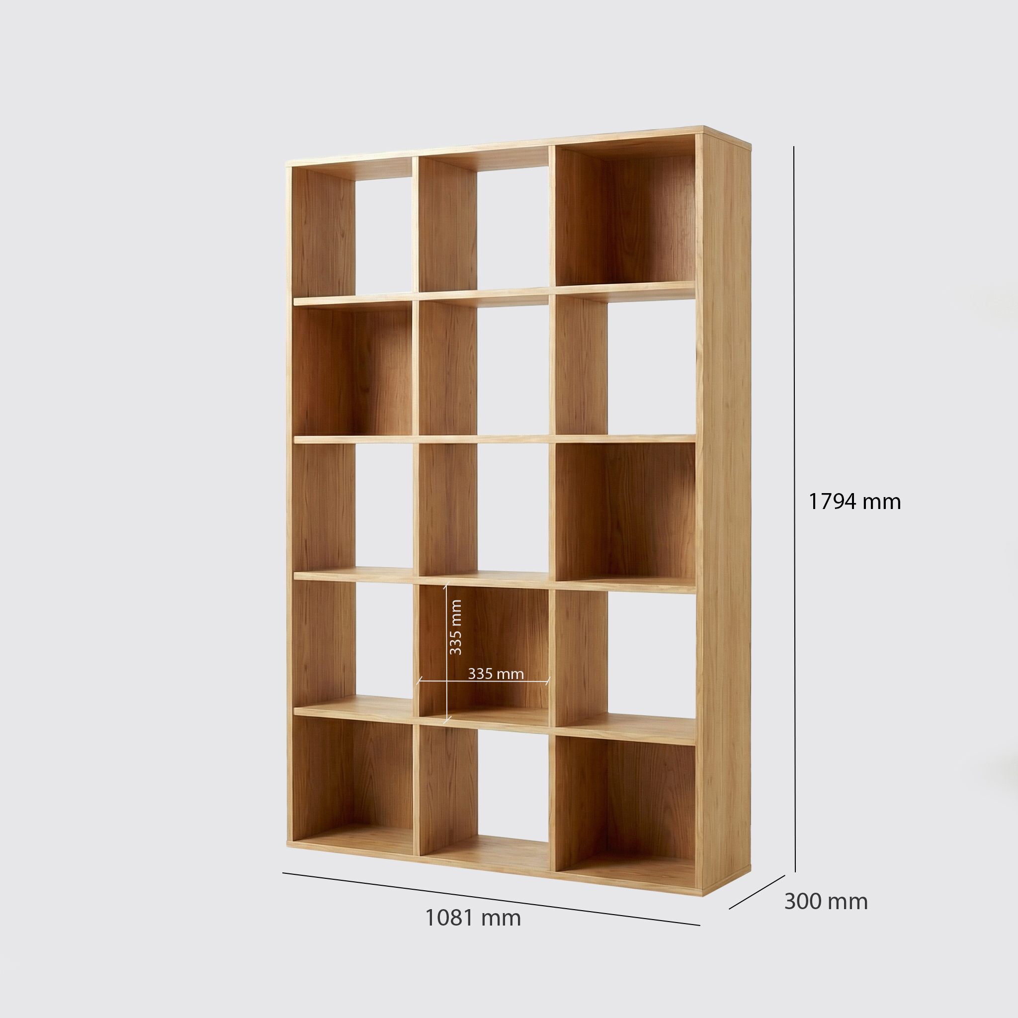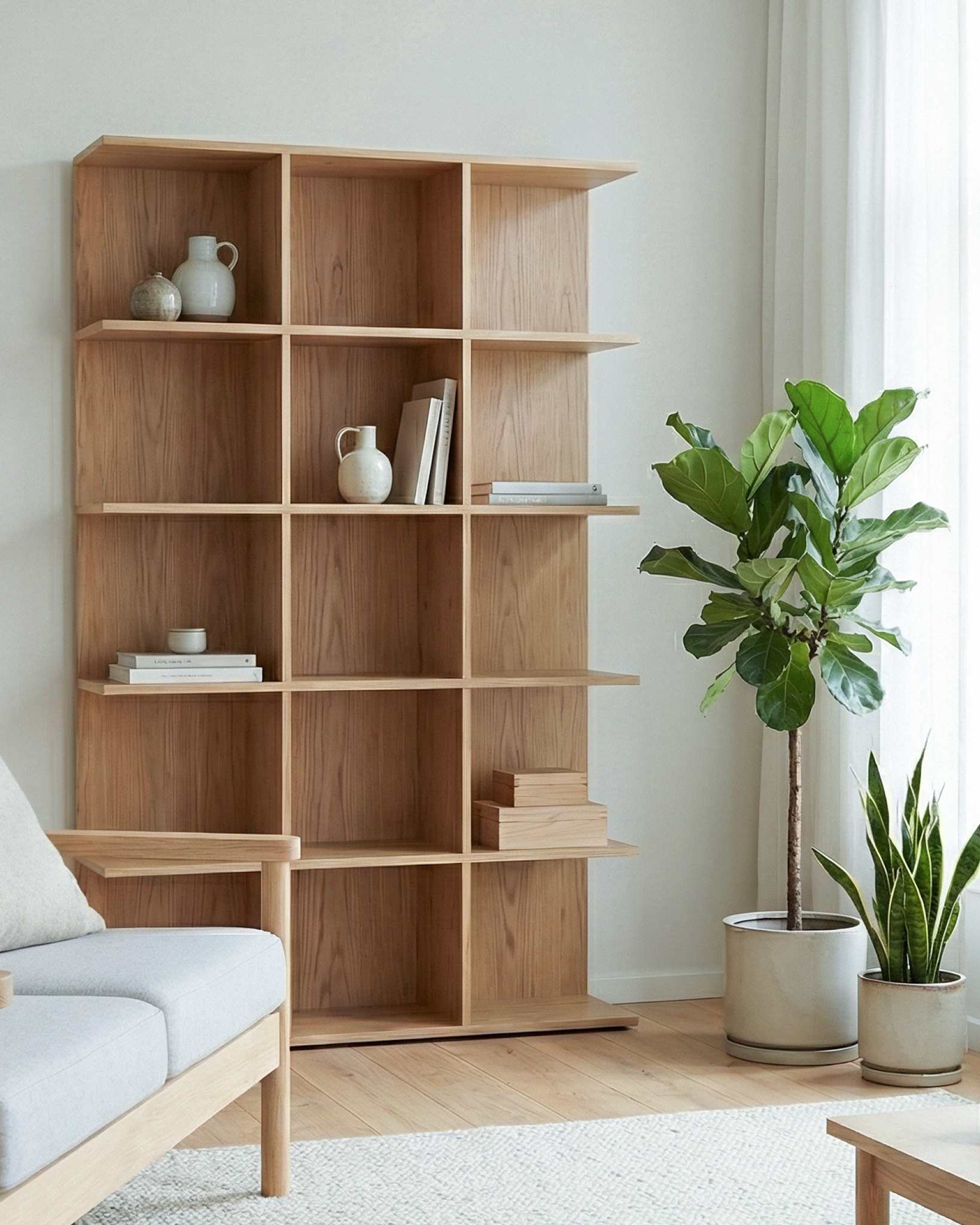 Układ 15 otwartych półek daje dużą swobodę aranżacyjną – regał doskonale nadaje się do przechowywania książek, dekoracji, ceramiki czy akcesoriów biurowych. Dzięki minimalistycznej formie i ciepłemu wykończeniu, Duplo harmonijnie wpisuje się w różne style wnętrz: od skandynawskiego, przez japandi, po nowoczesny minimalizm.