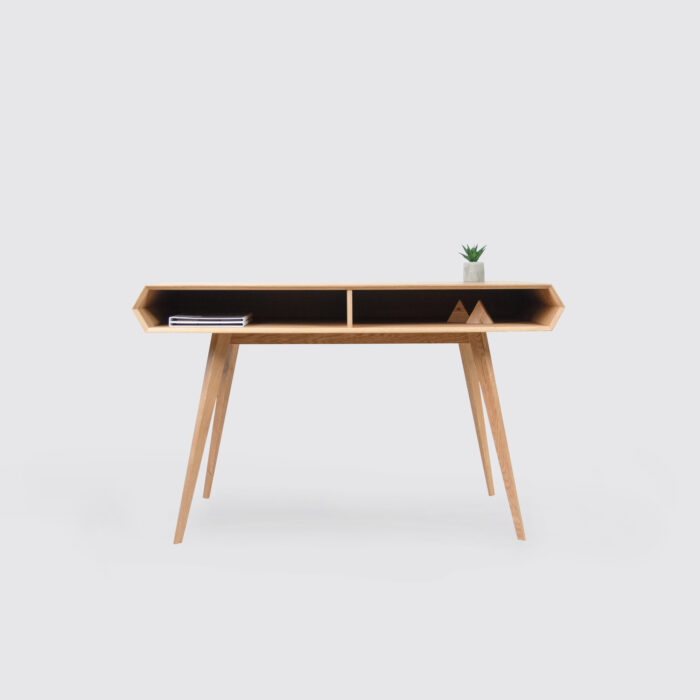 Nogi mebla wykonano z litego drewna dębowego. Korpus-drewno wykończone fornirem dębowym, całość zabezpieczona jest twardym olejowoskiem. Biurko wyposażone jest w drewnianą szufladę z systemem prowadnic TANDEM Tip-On marki Blum.