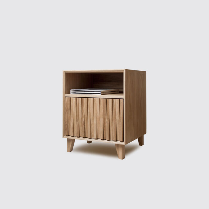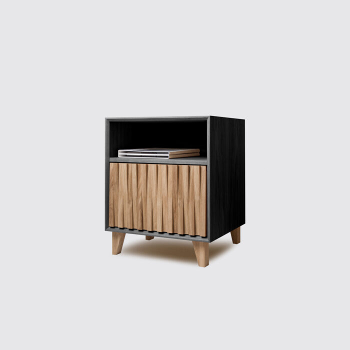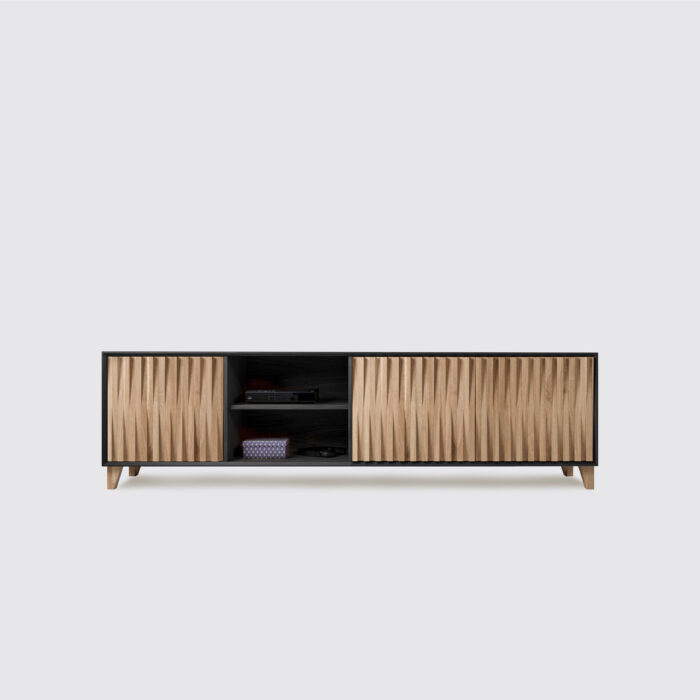 Heater Maxi. Stworzona z myślą o zestawie multimedialnym, w części z otwartymi półkami znalazło się miejsce na odtwarzacz DVD, konsolę i dekoder telewizyjny. Cztery otwarte półki pomieszczą kolekcję filmów lub płyt winylowych. Środkowa część to przestrzeń, na której wyeksponujesz rodzinne fotografie lub dekoracyjne pudełka. Za charakterystycznym, trójwymiarowym frontem kryją się cztery symetryczne półki. Mimo sporych wymiarów, komoda prezentuje się lekko i niebanalnie. Każdy z elementów został wykonany ręcznie. Komoda drewniana Heater powstaje z materiałów dostarczanych przez lokalnych dostawców, co pozwala nam prowadzić zaawansowaną kontrolę jakości każdego z komponentów.
