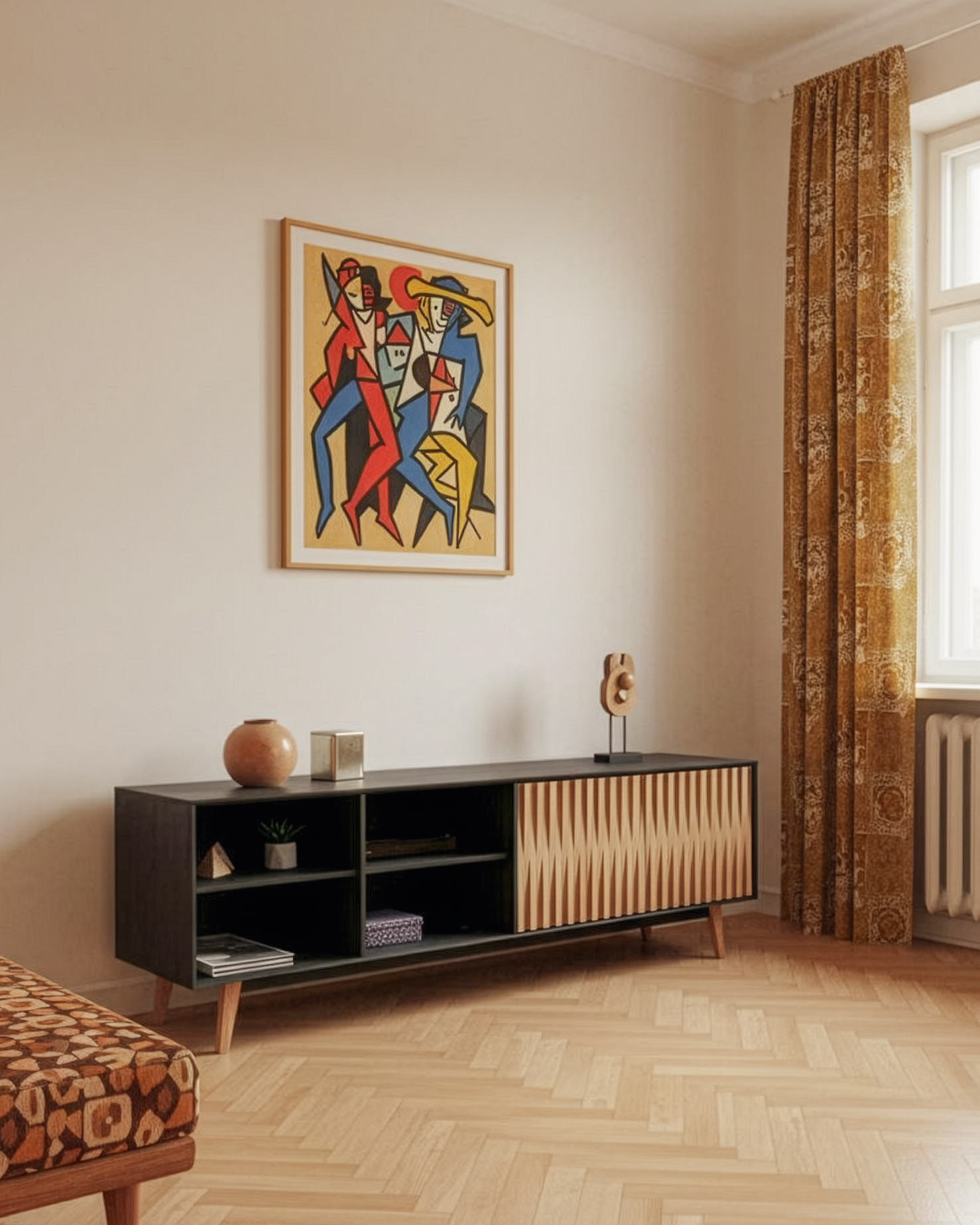 Heater Maxi Black.  Stworzona z myślą o zestawie multimedialnym, w części z otwartymi półkami znalazło się miejsce na odtwarzacz DVD, konsolę i dekoder telewizyjny. Cztery otwarte półki pomieszczą kolekcję filmów lub płyt winylowych. Środkowa część to przestrzeń, na której wyeksponujesz rodzinne fotografie lub dekoracyjne pudełka. Za charakterystycznym, trójwymiarowym frontem kryją się cztery symetryczne półki. Mimo sporych wymiarów, komoda prezentuje się lekko i niebanalnie. Każdy z elementów został wykonany ręcznie. Komoda drewniana Heater powstaje z materiałów dostarczanych przez lokalnych dostawców, co pozwala nam prowadzić zaawansowaną kontrolę jakości każdego z komponentów.
