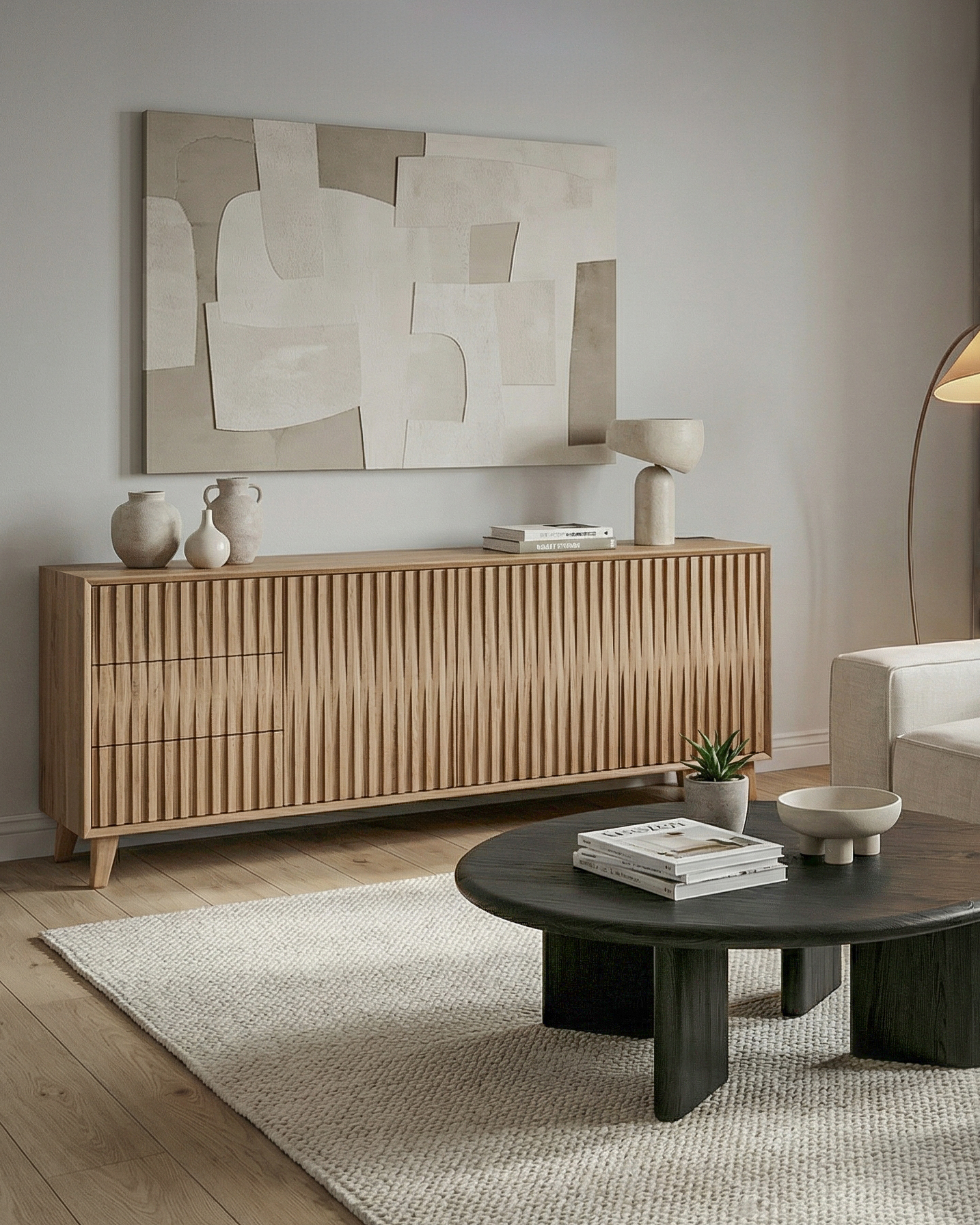 Heater Maxi HS. W części z otwartej znalazło się miejsce na książki, płyty lub sprzęt audio. Za charakterystycznym, trójwymiarowym frontem kryje się sześć symetrycznych półek. Komodę Heater Maxi High S wyposażyliśmy dodatkowo w trzy pojemne szuflady z systemem Movento / Tip-On blumotion marki Blum. Mimo sporych wymiarów, komoda prezentuje się lekko i niebanalnie. Debowy fornirowany korpus osadzono na drewnianych nogach. Każdy z elementów został wykonany ręcznie. Komoda drewniana Heater powstaje z materiałów dostarczanych przez lokalnych dostawców, co pozwala nam prowadzić zaawansowaną kontrolę jakości każdego z komponentów.