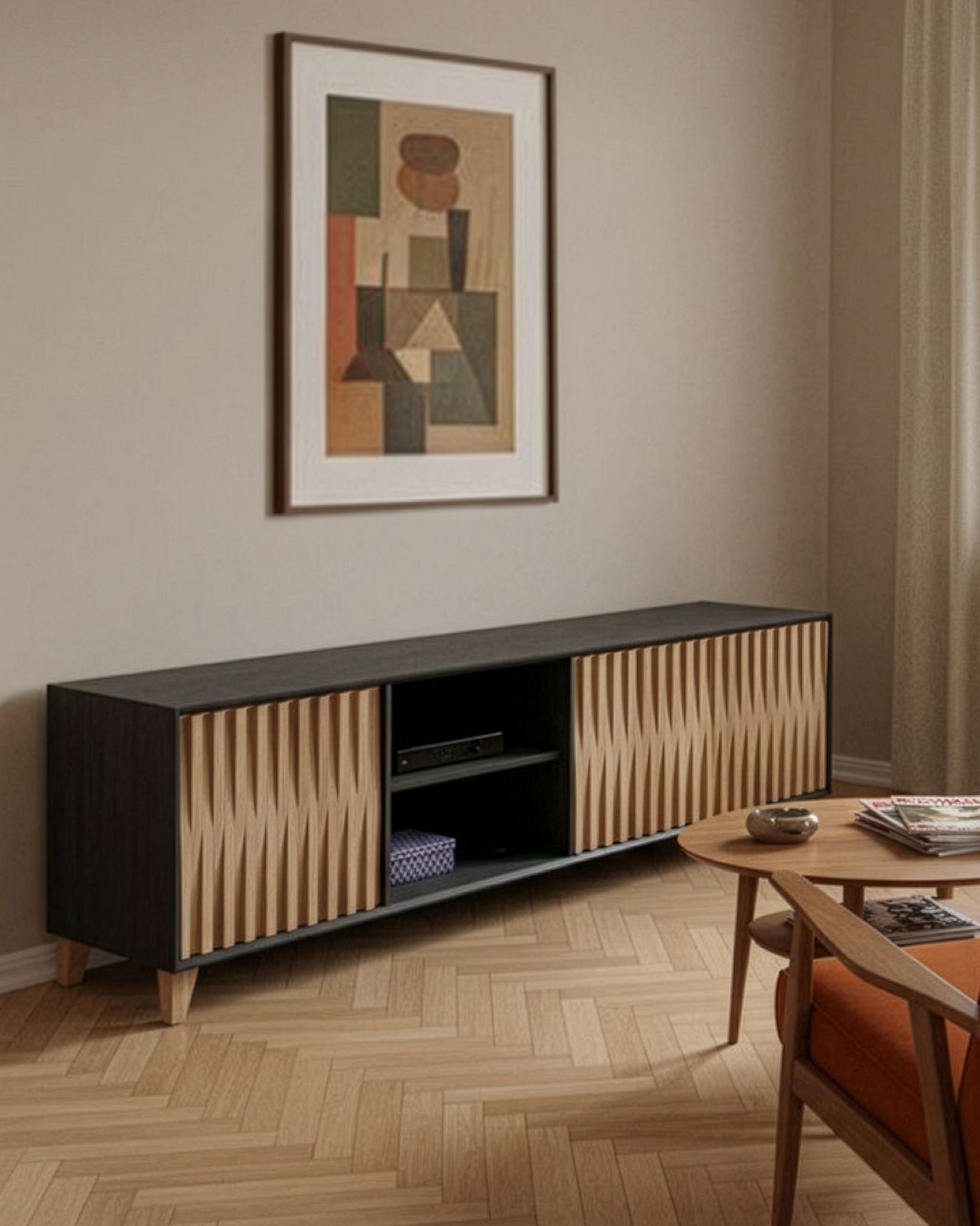 Heater Maxi + Black. Stworzona z myślą o zestawie multimedialnym, w części z otwartej znalazło się miejsce na konsolę i dekoder telewizyjny. Za charakterystycznym, trójwymiarowym frontem kryje się sześć symetrycznych półek. Mimo sporych wymiarów, komoda prezentuje się lekko i niebanalnie. Debowy fornirowany korpus osadzono na drewnianych nogach. Każdy z elementów został wykonany ręcznie. Komoda drewniana Heater powstaje z materiałów dostarczanych przez lokalnych dostawców, co pozwala nam prowadzić zaawansowaną kontrolę jakości każdego z komponentów.