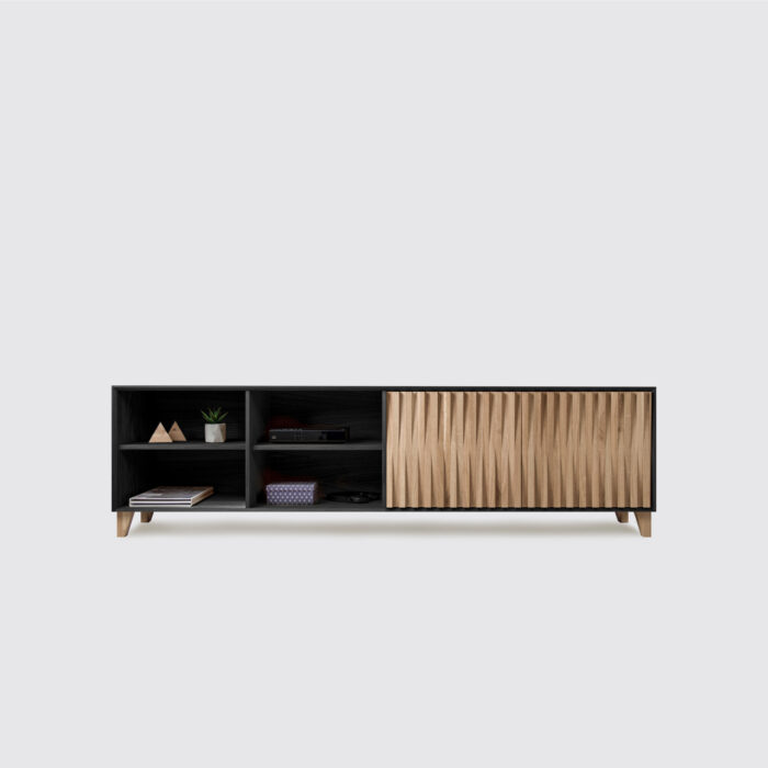 Heater Mini black to mebel wyjątkowy. Najmniejsza z sióstr z kultowej rodziny mebli do przechowywania, zmieści się dosłownie wszędzie. Kompaktowe rozmiary czynią z niej mebel, który zmieści się w ściennym załamaniu lub pod ukośnym sufitem na strychu. Jeśli szukasz pojemnego mebla do niewielkiego wnętrza ta drewniana komoda będzie strzałem w dziesiątkę. Cztery półki dają sporo przestrzeni do przechowywania. Na otwartych, wyeksponujesz kolekcję ulubionych płyt lub filmów, a półki ukryte za trójwymiarowym, drewnianym frontem pomieszczą ubrania lub inne rzeczy, których nie chcesz pokazywać gościom odwiedzającym Twój dom. Solidna, geometryczna konstrukcja została osadzona na drewnianych nóżkach, przez co forma mebla pozostała lekka i powabna.