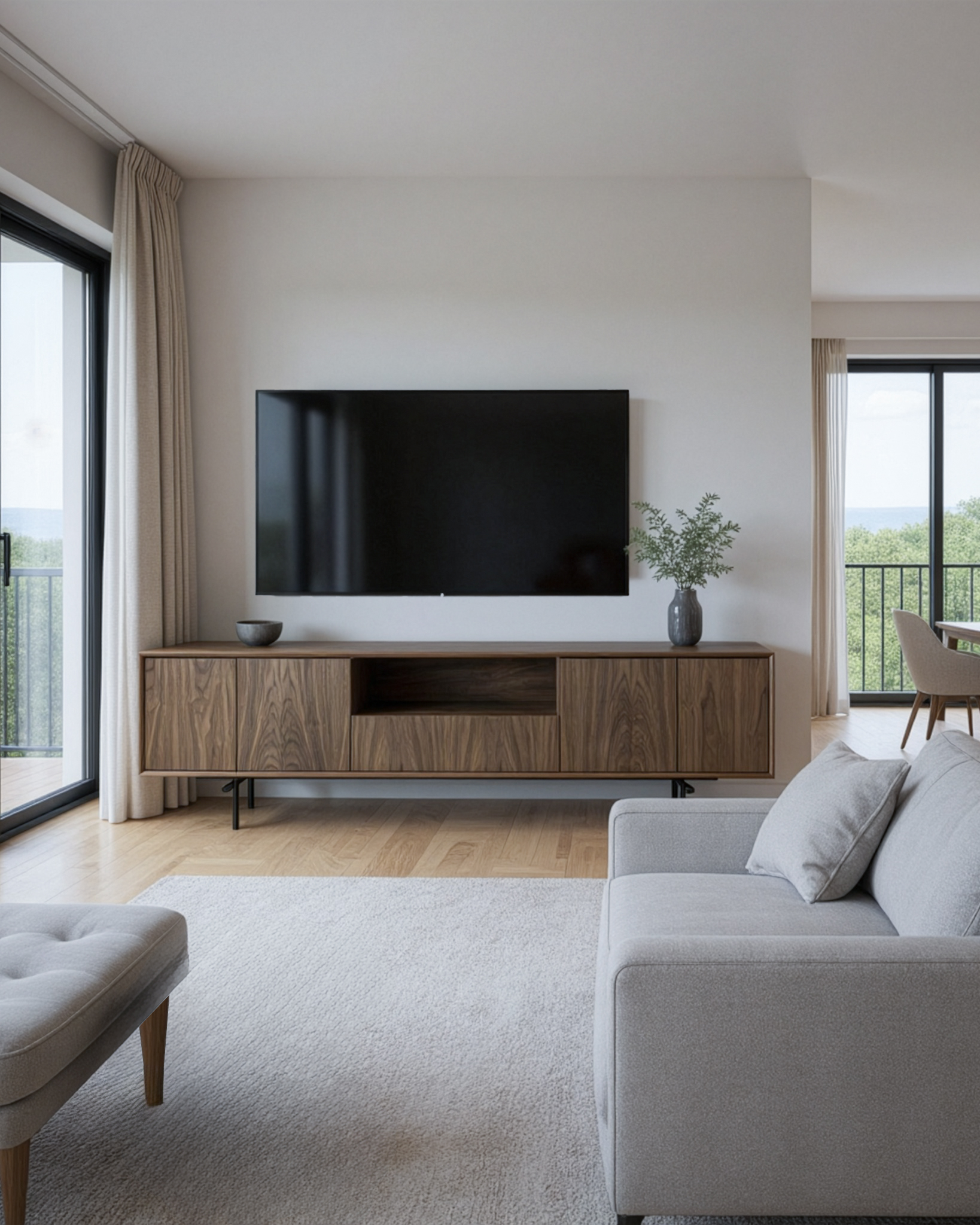 Komoda Roomy to praktyczny, pojemny mebel, który łatwo dostosujesz do wymagań projektu, ponieważ jest dostępna w dwóch długościach–2000, 2200 mm oraz w dwóch wariantach wyposażenia. Mebel wykonany jest z drewna, w szlachetnym, fornirowanym wykończeniu. Całość została zabezpieczona olejowoskiem w naturalnym odcieniu. System otwierania tip-on marki Blum pozwala na otwieranie frontów pozbawionych uchwytów przez naciśnięcie dłonią.