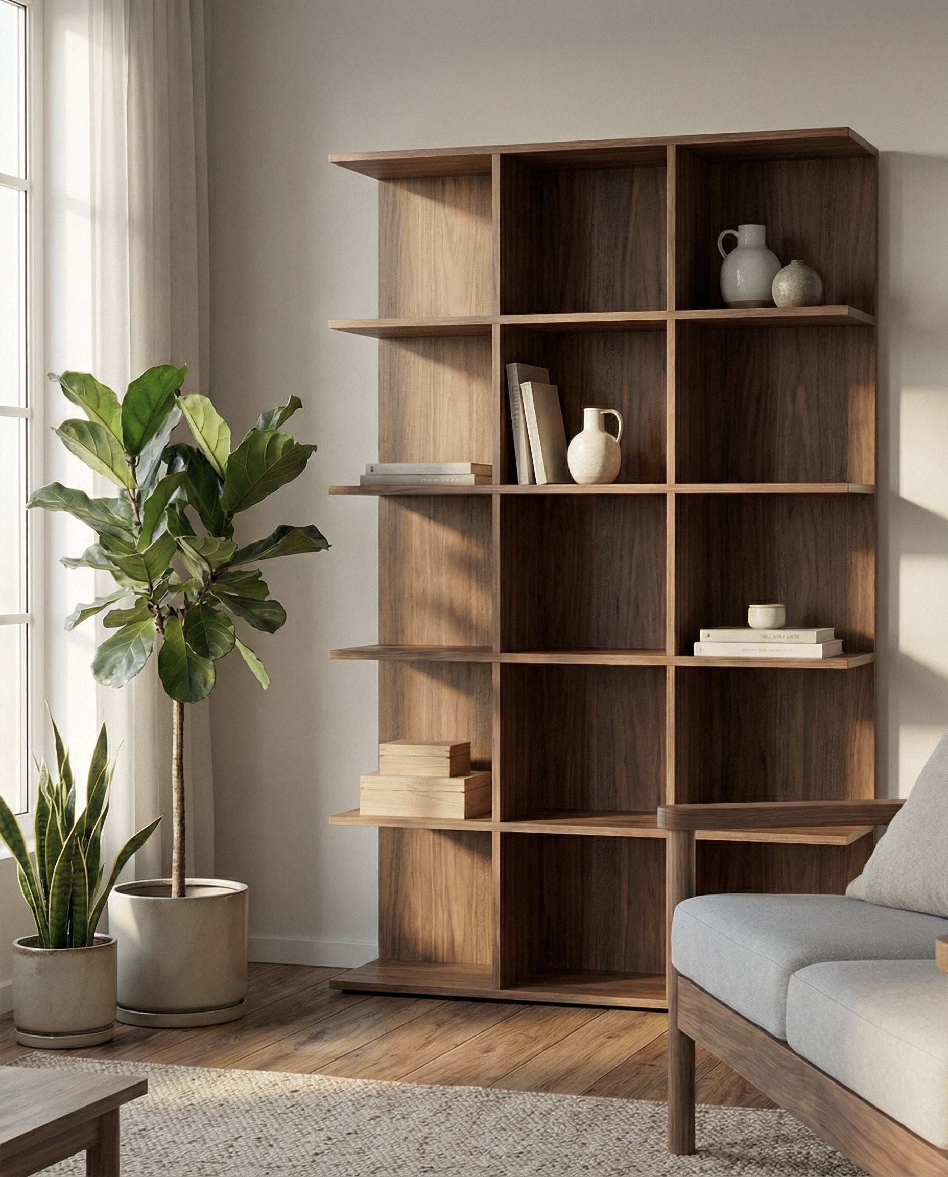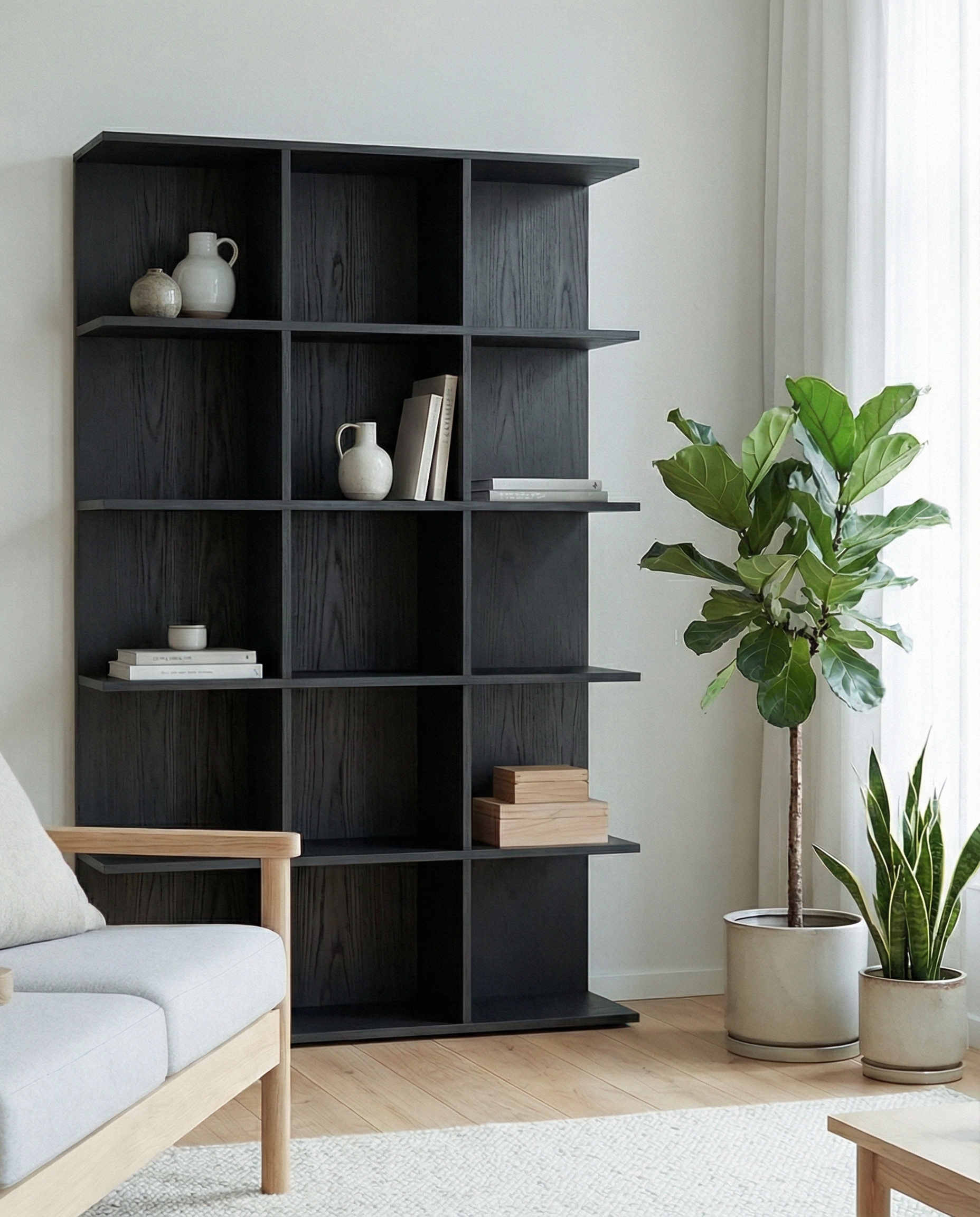 Układ 15 otwartych półek daje dużą swobodę aranżacyjną – regał doskonale nadaje się do przechowywania książek, dekoracji, ceramiki czy akcesoriów biurowych. Dzięki minimalistycznej formie i ciepłemu wykończeniu, Duplo harmonijnie wpisuje się w różne style wnętrz: od skandynawskiego, przez japandi, po nowoczesny minimalizm.
