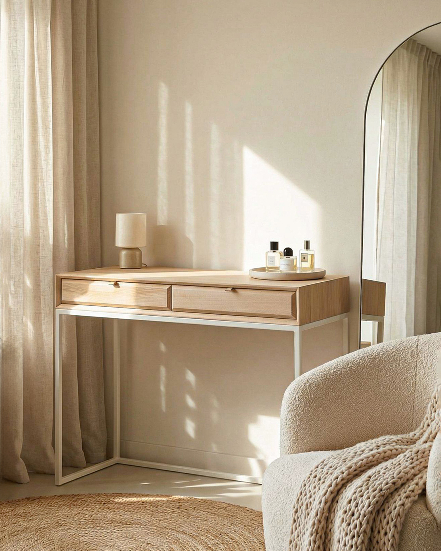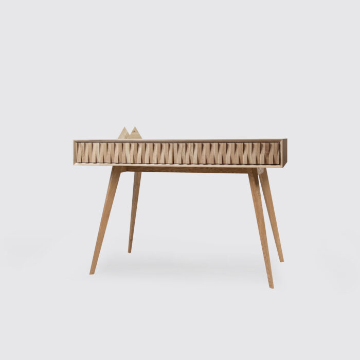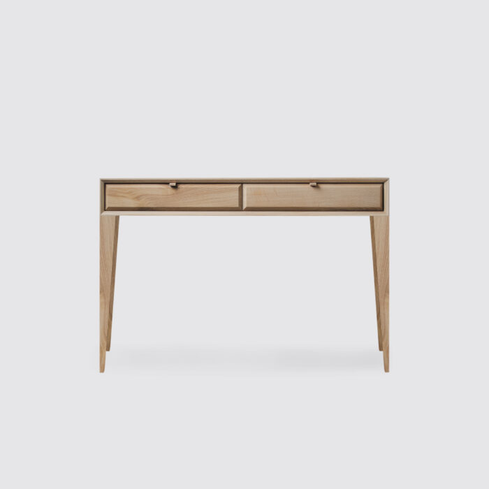 Toaletka White Oak to królowa symetrii. W prostej formie zamknęliśmy moc elegancji, stylu i klasy, by cieszyć każdą zadbaną damę. Minimalistyczna toaletka pozwoli na uporządkowanie Twojej kolekcji kosmetyków. Na blacie zmieszczą się ulubione pachnidła, a w szufladach kremy i balsamy, których używasz rzadziej. Dwie pojemne szuflady pomieszczą obszerny zbiór, godny każdej Beauty Ekspertki. Od dziś zaoszczędzisz na czasie podczas wykonywania porannego makijażu, zamiast szukać kosmetyków dziesiątkach pudełek, koszy i kosmetyczek szybko odszukasz je w przepastnych szufladach Toaletki White Oak. Mebel wyróżniają miękko ścięte brzegi szuflad, a projekt łączy klasykę i nowoczesność. Toaletka odnajdzie się w rustykalnych wnętrzach oraz ultranowoczesnych apartamentach. To absolutny „must have” każdej zadbanej Pani.